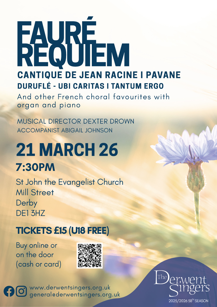 Fauré Requiem And other French Choral favourites with organ and piano. . . Date(s)Saturday 21st March 2026Time(s)7.30pmLocationSt John the Evangelist Church, Mill Street, Derby, DE1 3HZ Purchase Tickets: £15 per person ( Under 18s free)